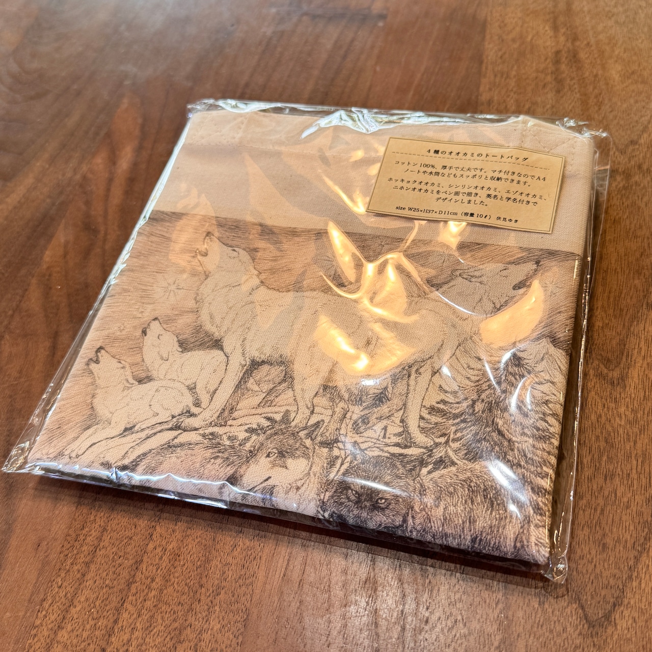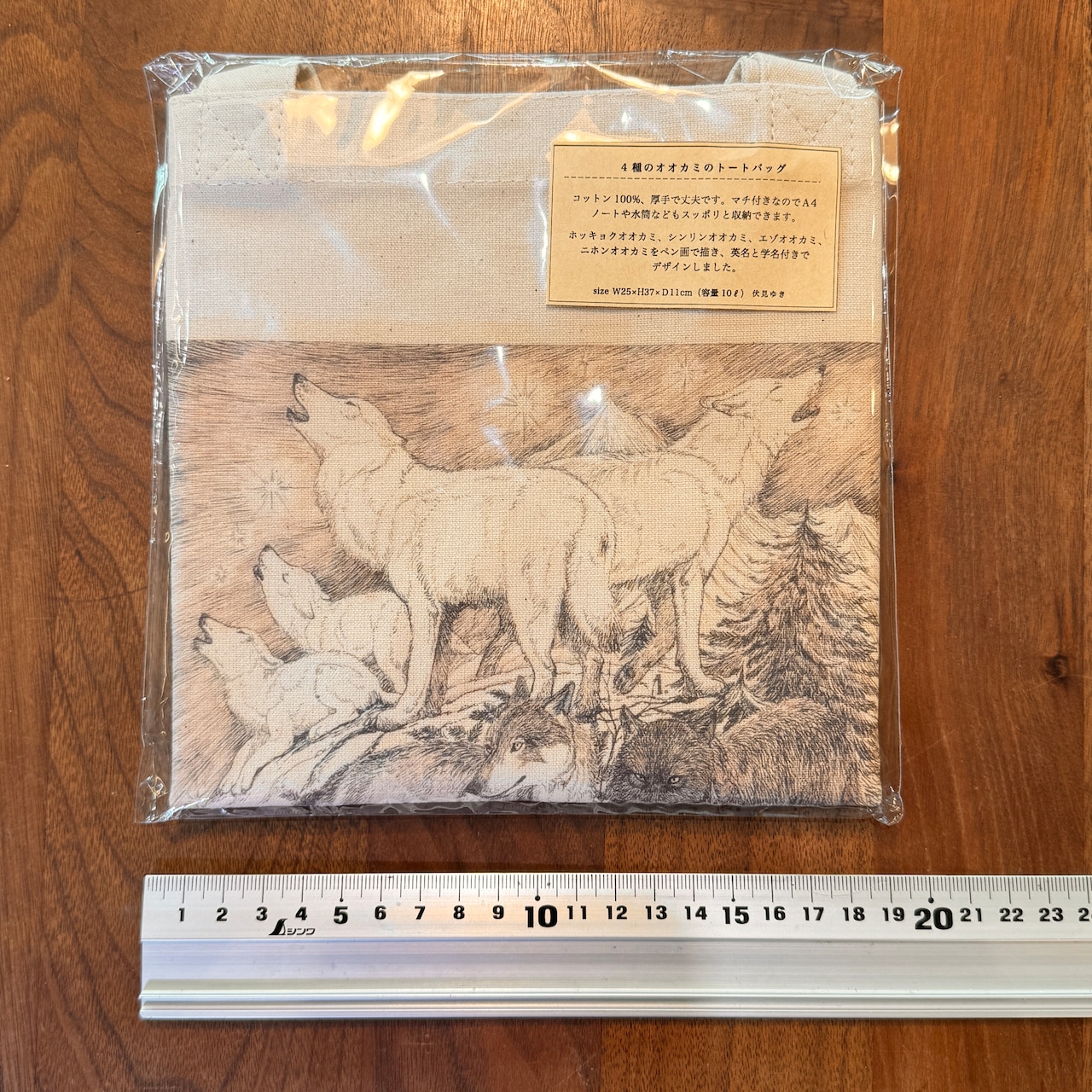 4種類のオオカミ(ホッキョクオオカミ、シンリンオオカミ、エゾオオカミ、ニホンオオカミ)をペン画で描き、トートバッグに印刷しました。