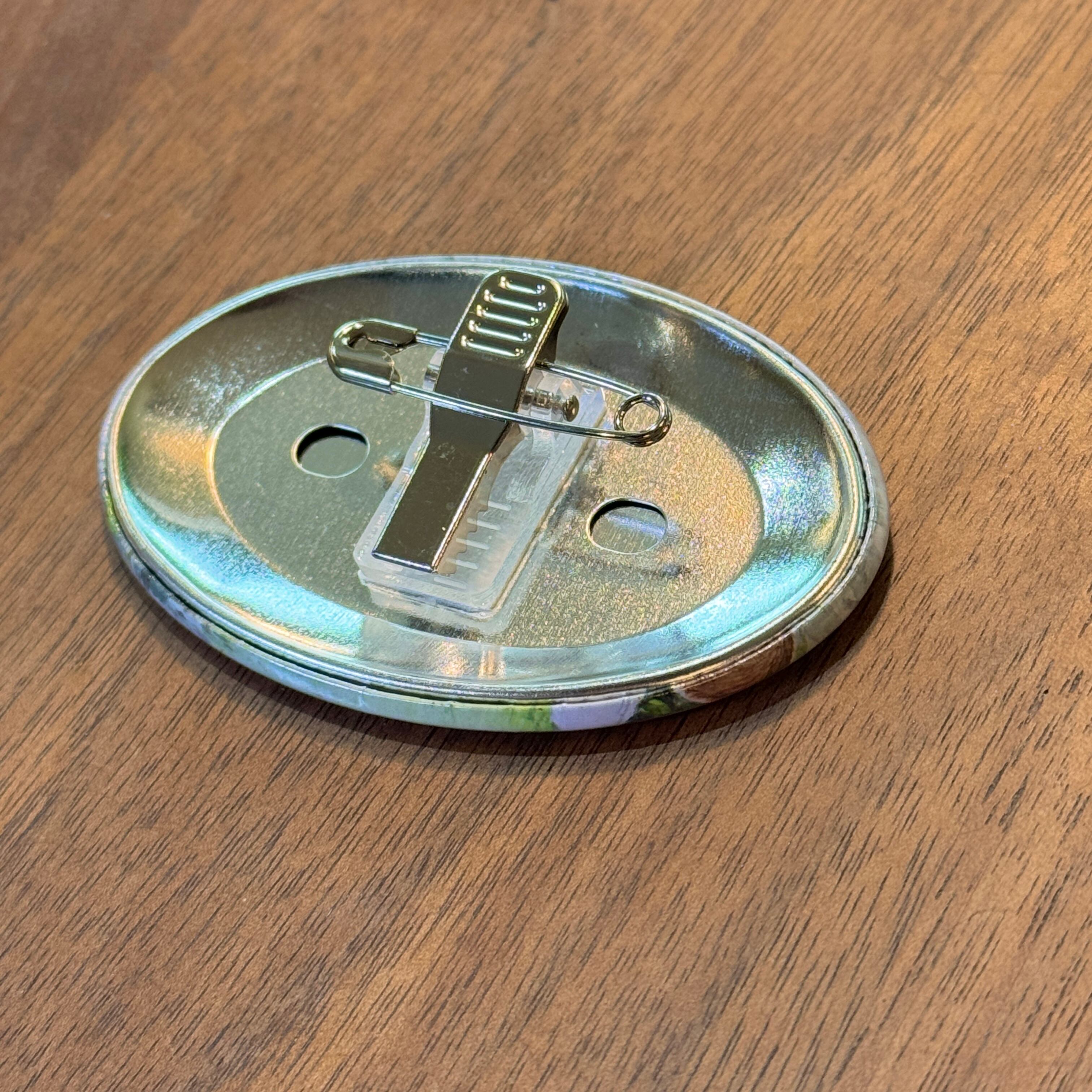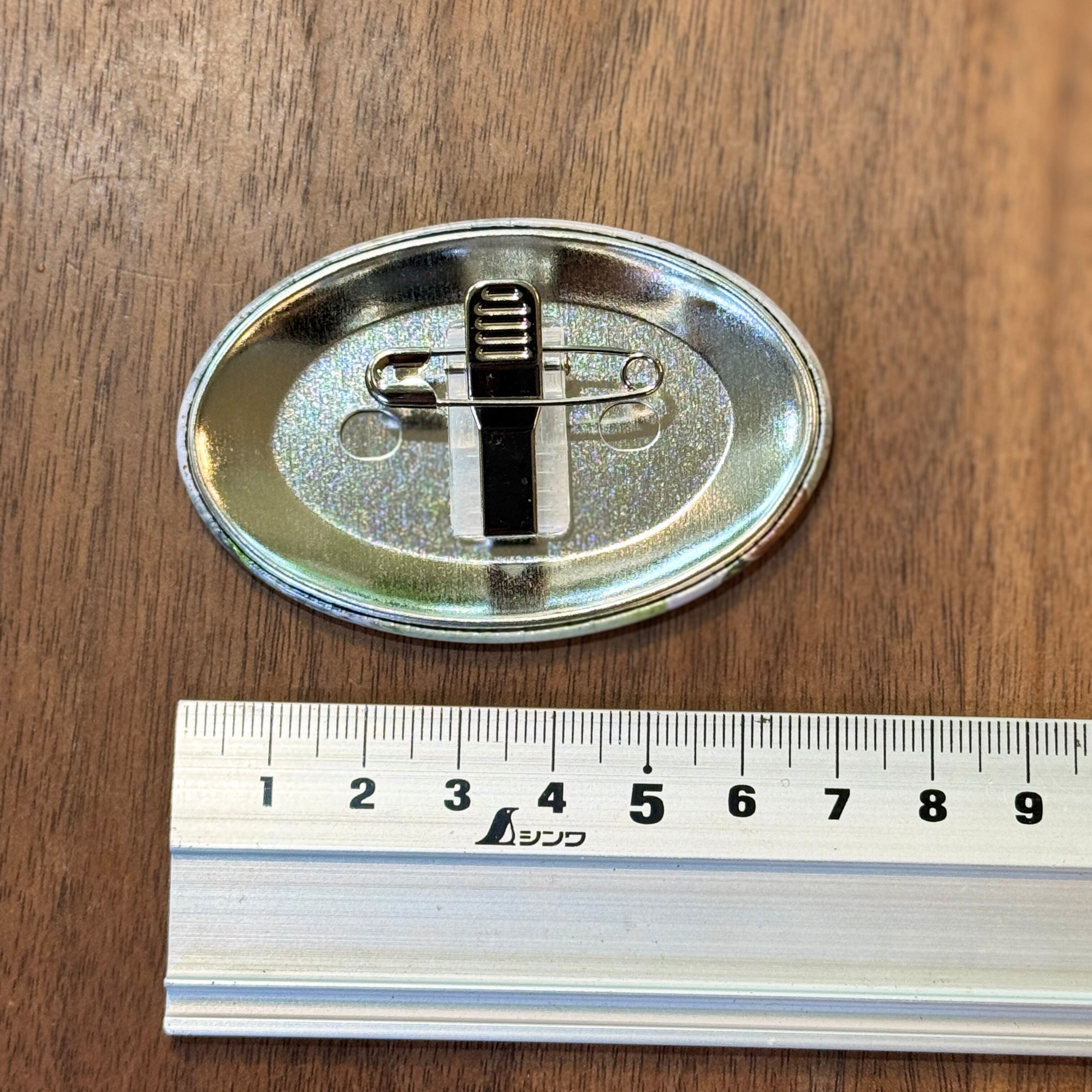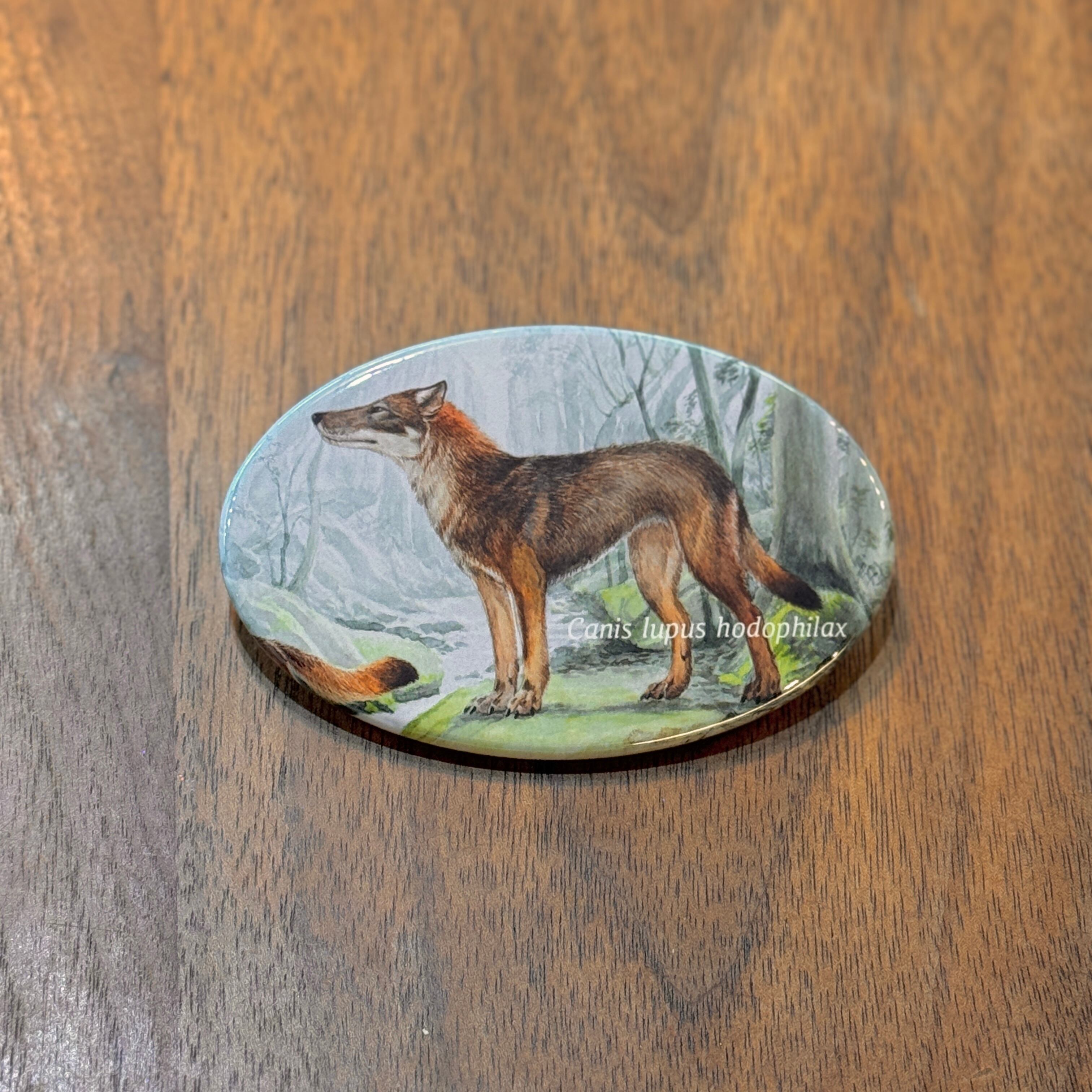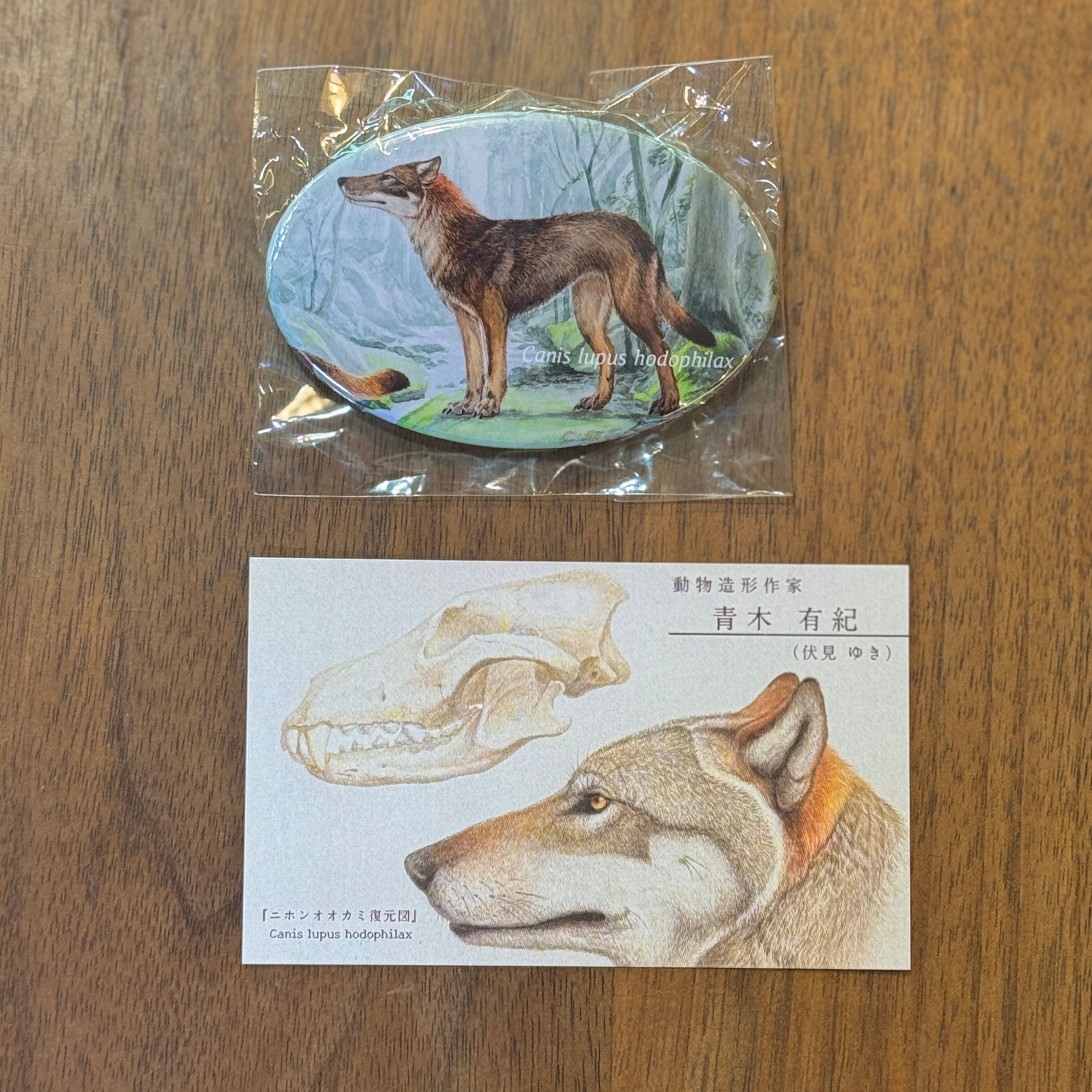 ニホンオオカミを水彩絵具で描き、缶バッジに学名入りで印刷しました。
