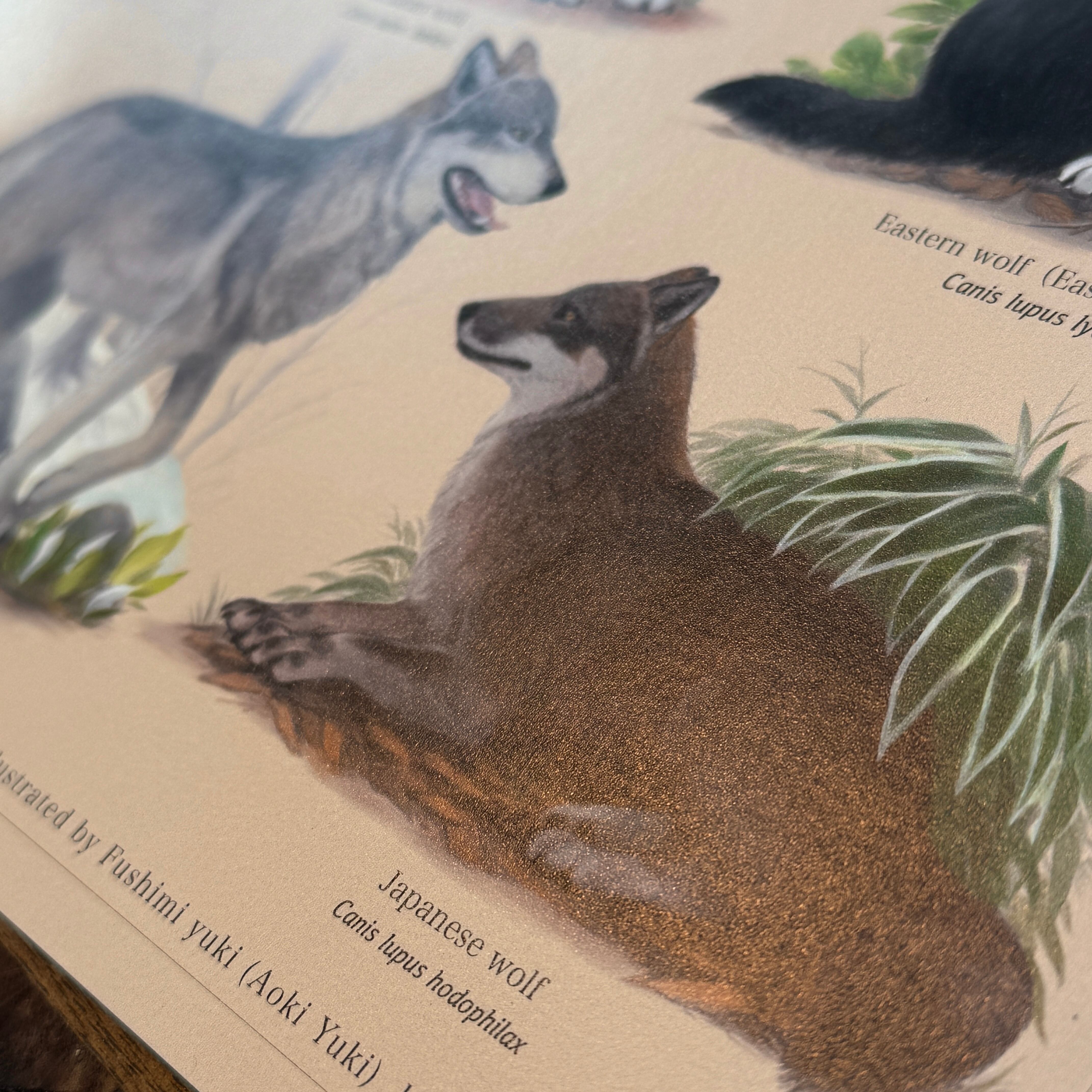 ホッキョクオオカミ、タイリクオオカミ、メキシコオオカミ、シンリンオオカミ、エゾオオカミ、ニホンオオカミを描いたポスターです。