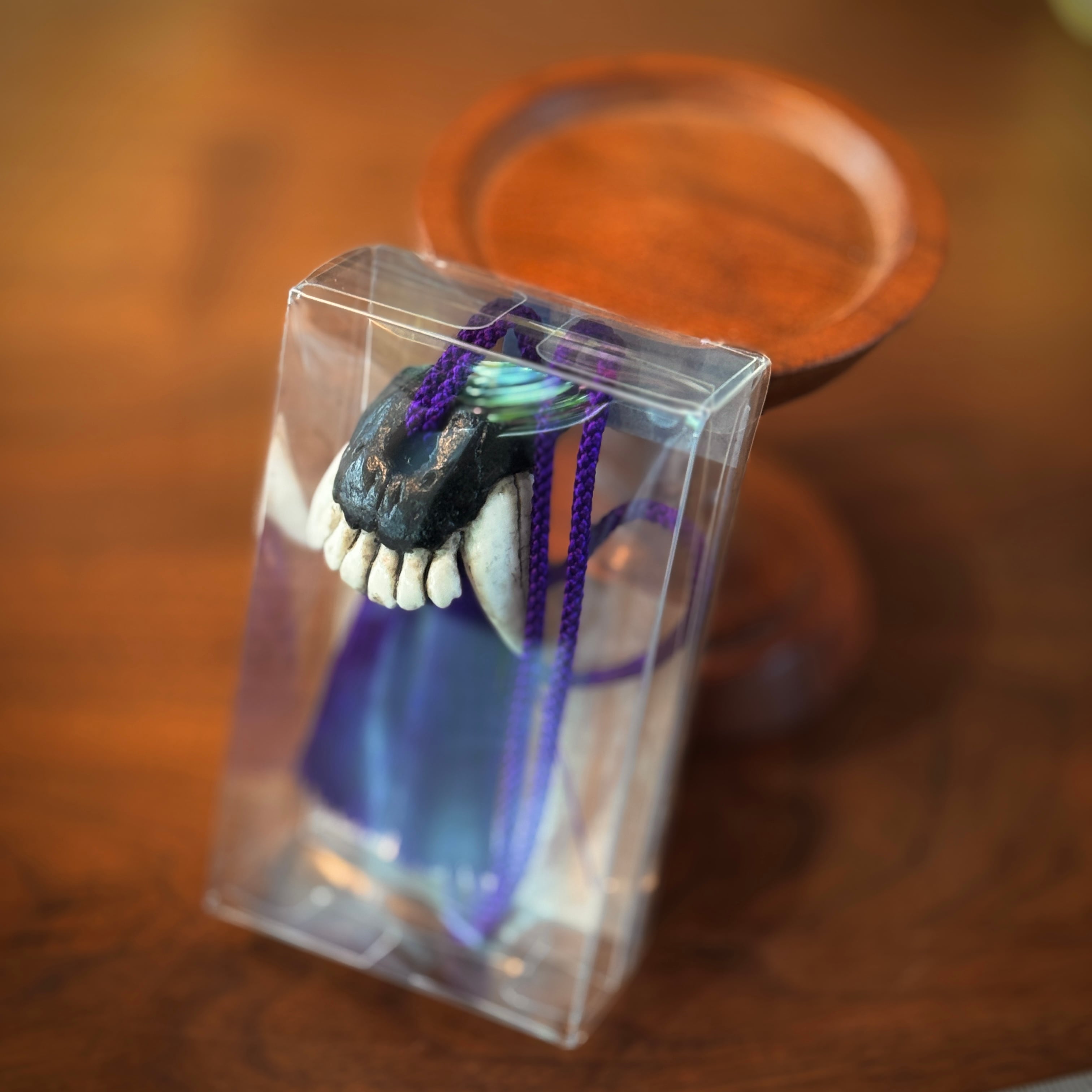 ニホンオオカミの下顎先端部を、資料を参照しながらスカルピー粘土で造形し、シリコン型にてレジン複製。耐水塗料にて手彩色で塗装し、組みひも(細江戸打両切房・レーヨン製)に通しました。