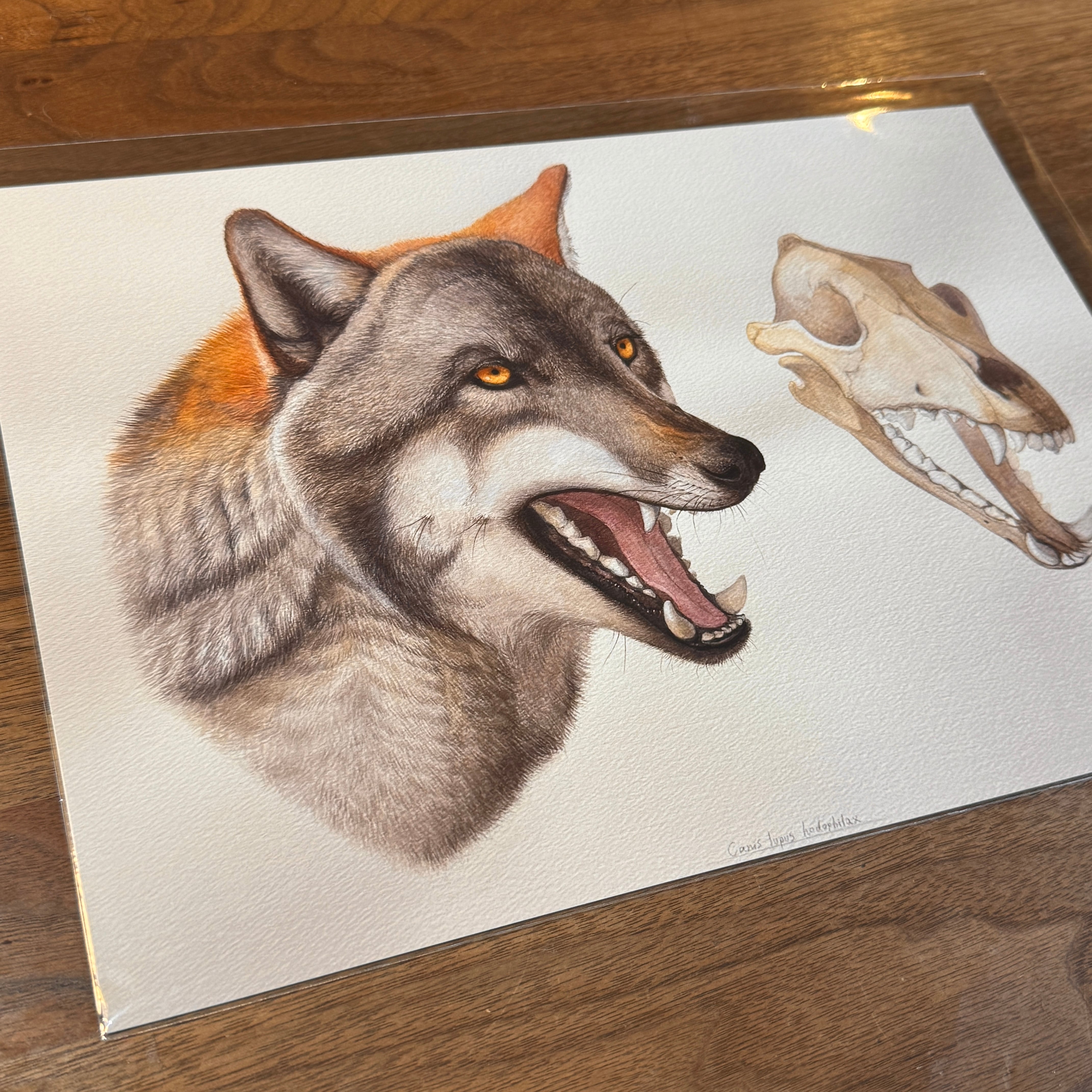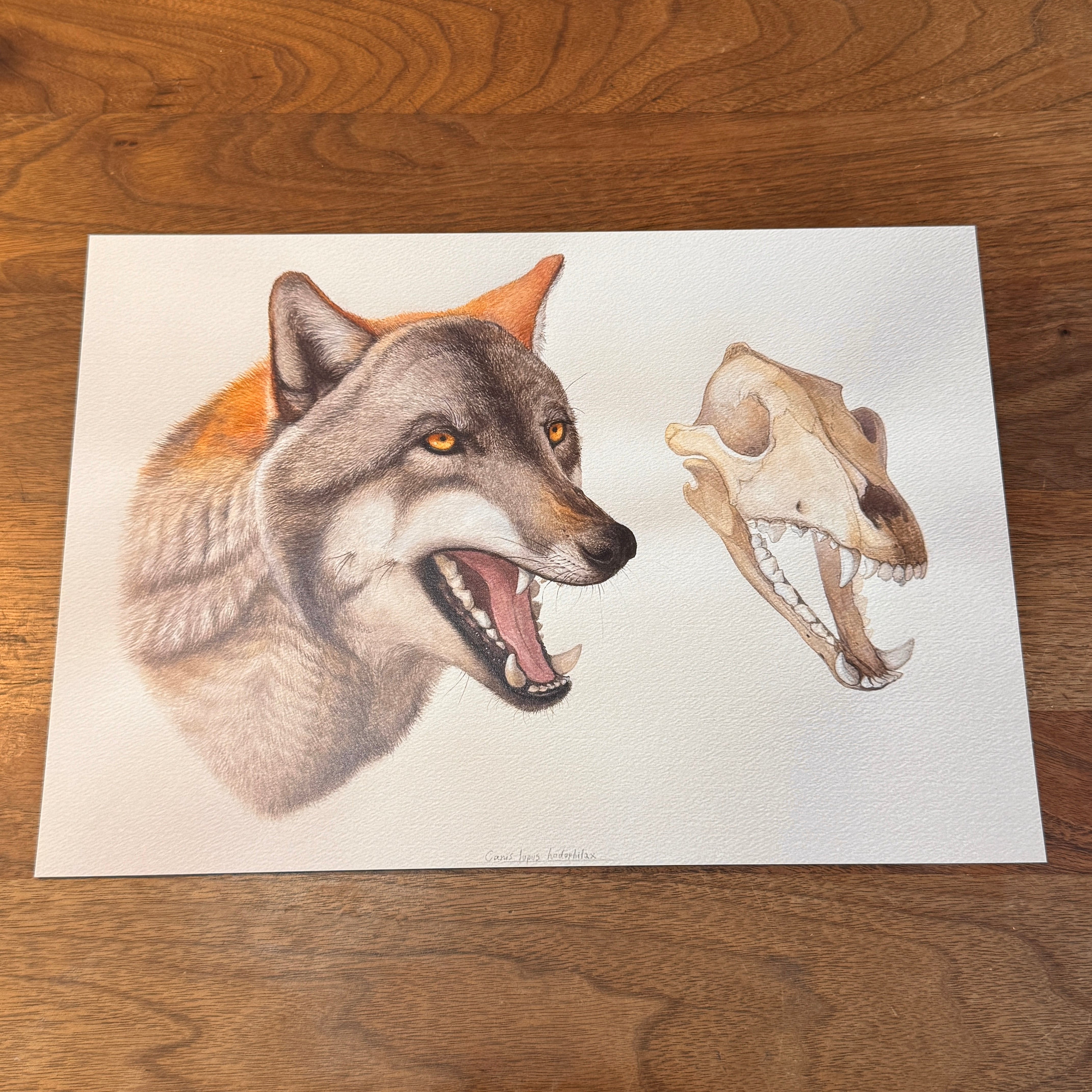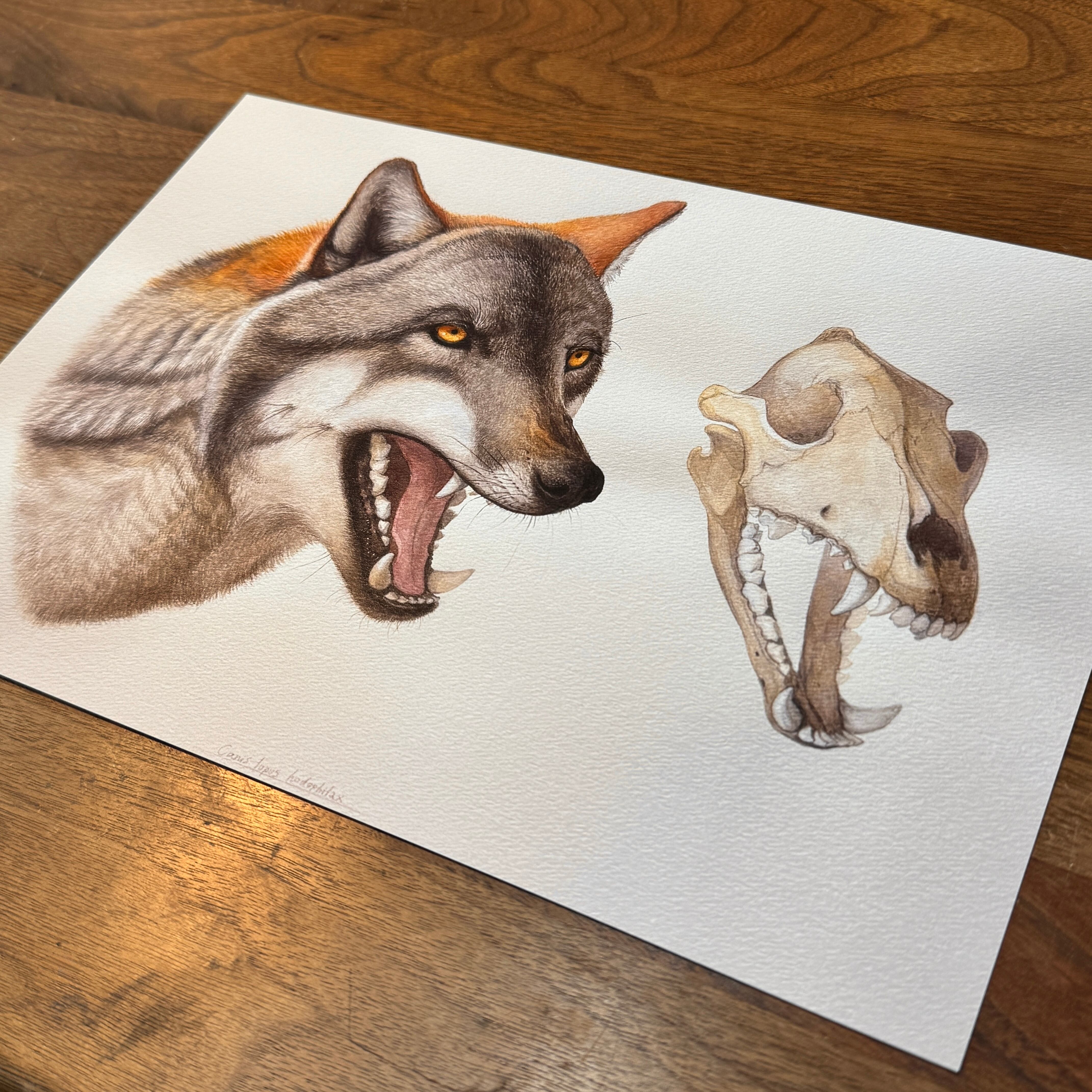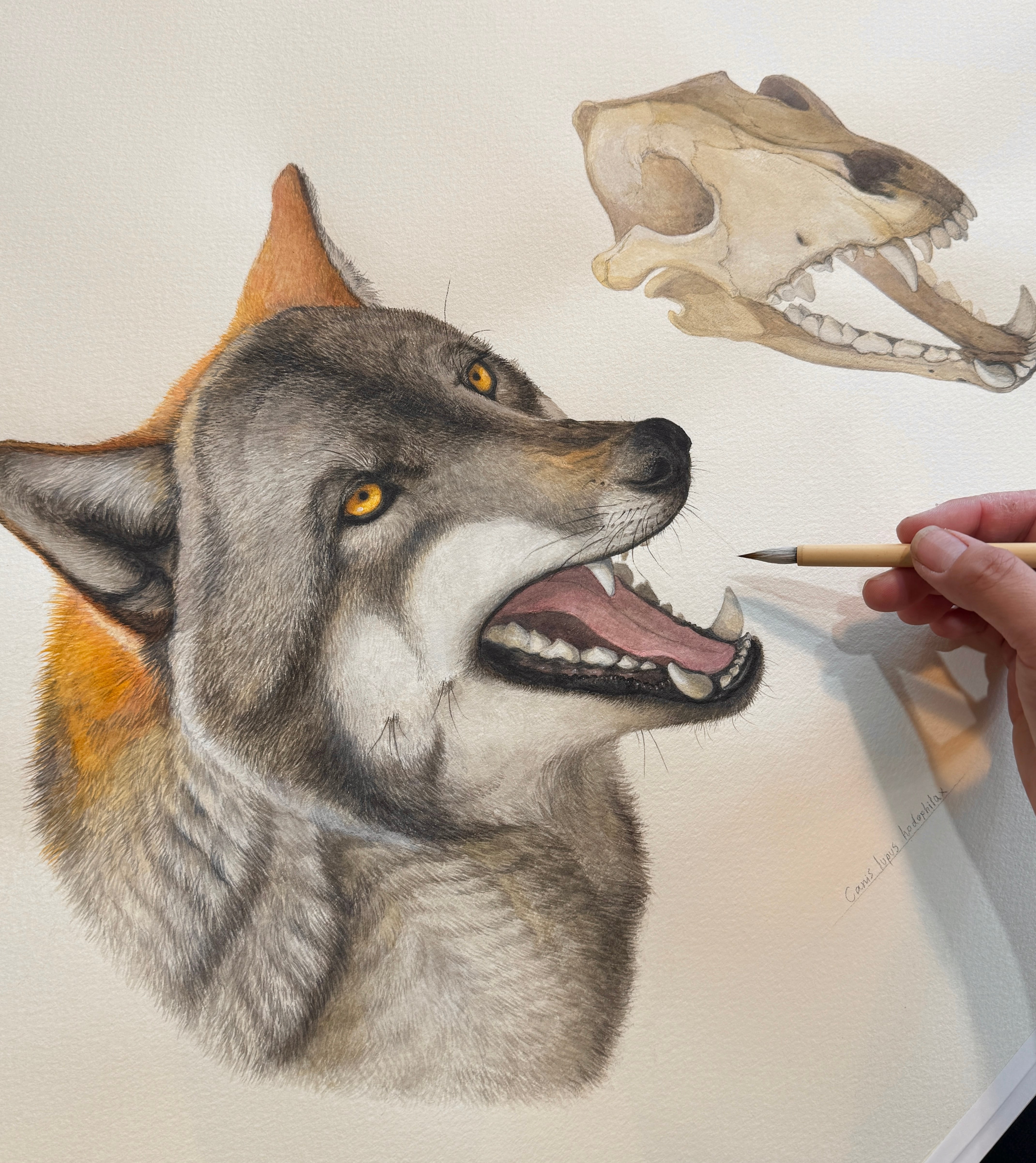 ・ニホンオオカミの頭骨を元に、復元画を作成しました。描画には水彩絵具と鉛筆を使用しています。
